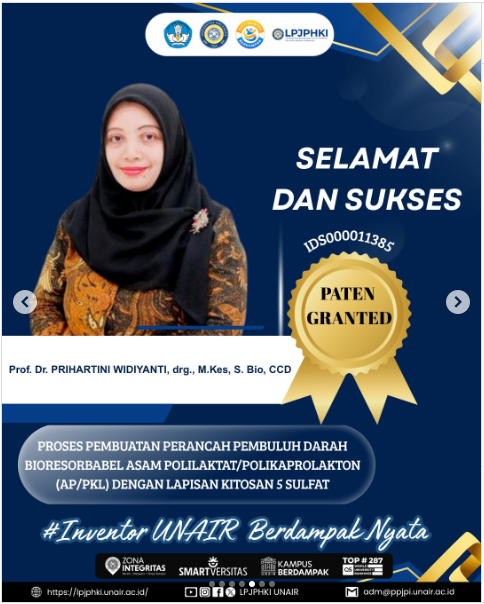 Prof. Dr. Prihartini Widiyanti, drg., M.Kes., S.Bio., CCD has successfully obtained a granted patent titled “Process for Manufacturing Bioresorbable Polylactic Acid/Polylactide (PLA/PLLA) Blood Vessel Scaffolds with a 5-Sulfate Chitosan Layer” with the number IDS000011385.